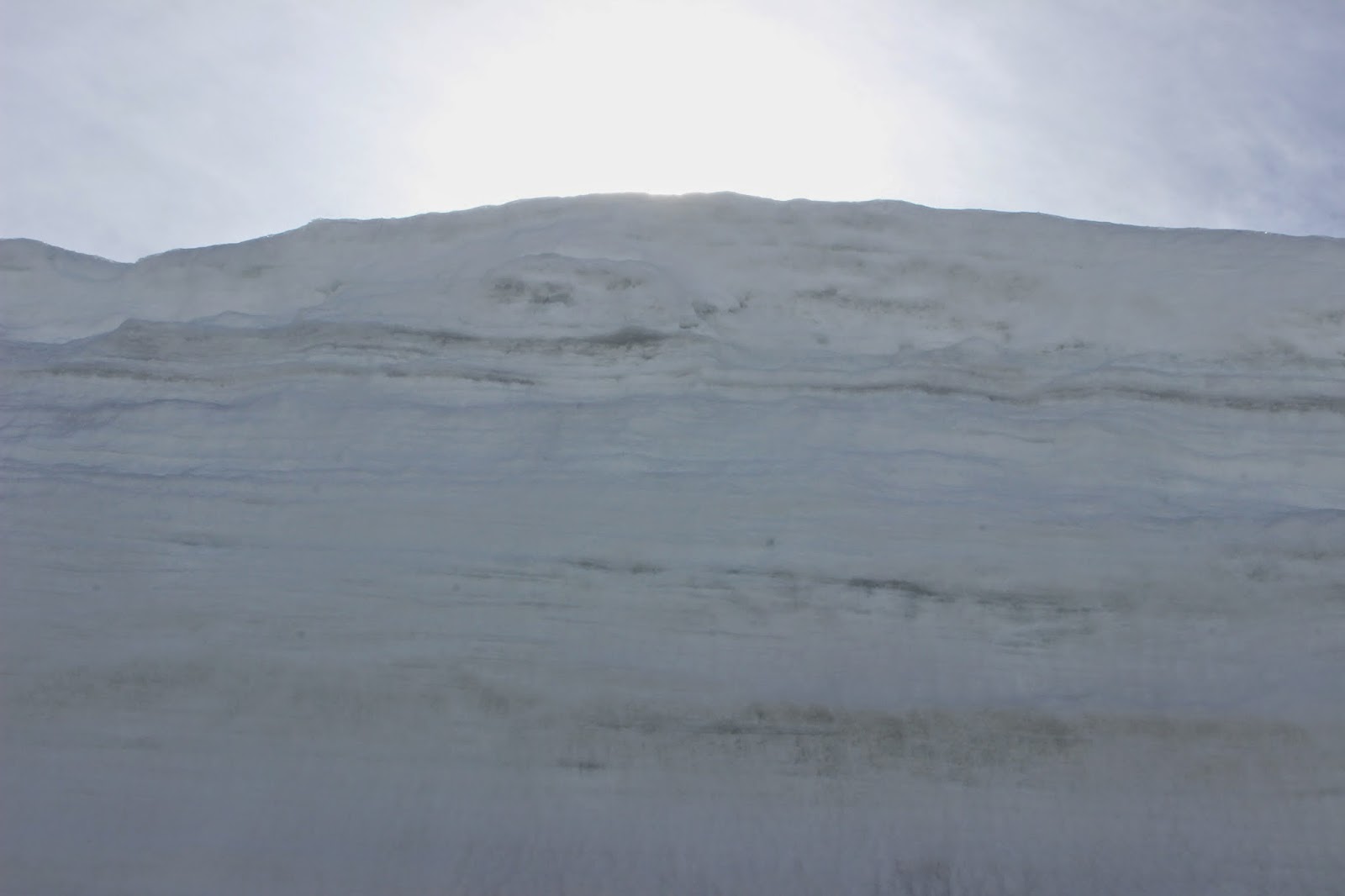 Sebenarnya dinding ni bukan dibina. Tapi dia asalnya satu permukaan salji yang tebal. Kalau tengok dekat, kiter boleh nampak ada jalur2 pada dinding salji tu. Ia menunjukkan perbezaan waktu salji tu turun. Kalau time hujan lain, time sejuk betul lain, time hangat2 sikit lain dan sebagainya. Ada aku ambik gambar maklumat ni. Kiranya selepas habis winter dan salji dah tak turun lagi dah, salji2 yang menebal ini akan mengeras la kan. Dia tak cair sebab kat atas gunung ni sejuk. Masa aku pergi ni -1 degree celcius.
